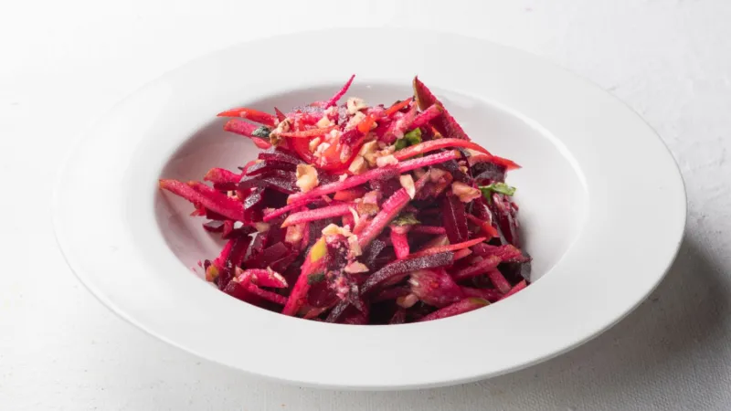 Свекла отварная, яблоко, сельдерей, огурец, морковь, лист салата, черри, лук зеленый, зелень, грецкий орех, сок лимона.