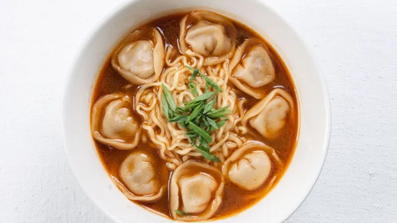 Лапша яичная, пельмени с говядиной, зеленый лук