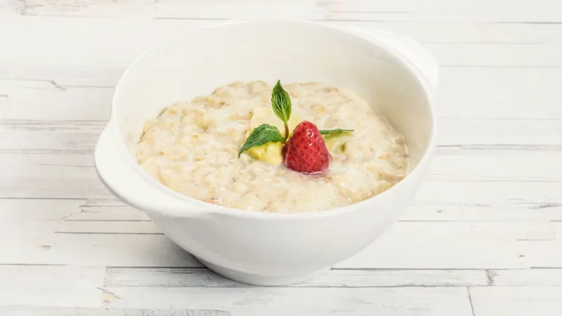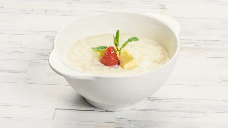 Молоко, рис, сахар, соль, масло сливочное, ягода свежемороженая, мята