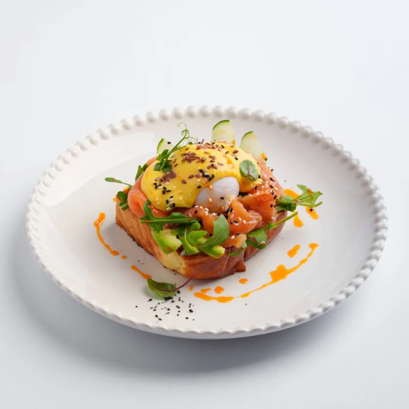 бриошь, голландский соус, руккола, огурец, слабосоленый лосось, яйцо пашот