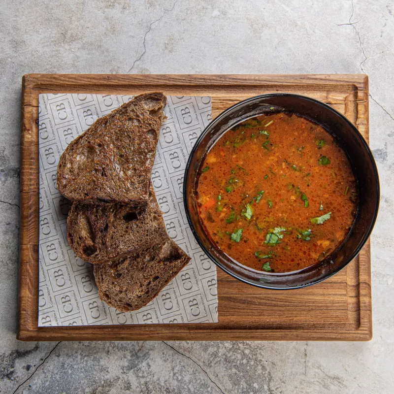 классический суп харчо с говядиной, подается с ломтиком солодового хлеба