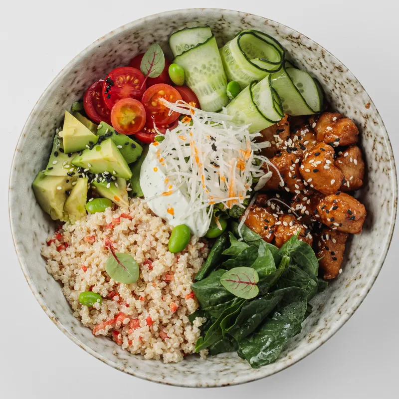 На выбор: киноа, черный рис, рис, куриное филе, соус терияки авокадо, огурец, томаты черри, ореховый соус, соус свит чили, дайкон, фасоль эдемами