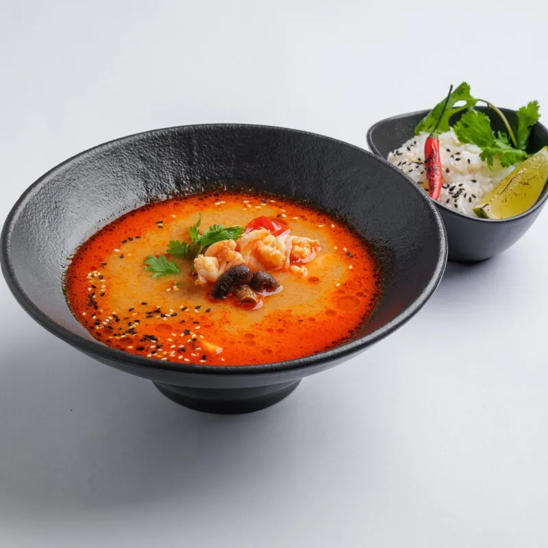 классический суп: кокосовое молоко, томаты черри, грибы шиитаке, креветки, кальмар, корень галангала, лимонная трава, лист лайма, рис, перец чили, лайм