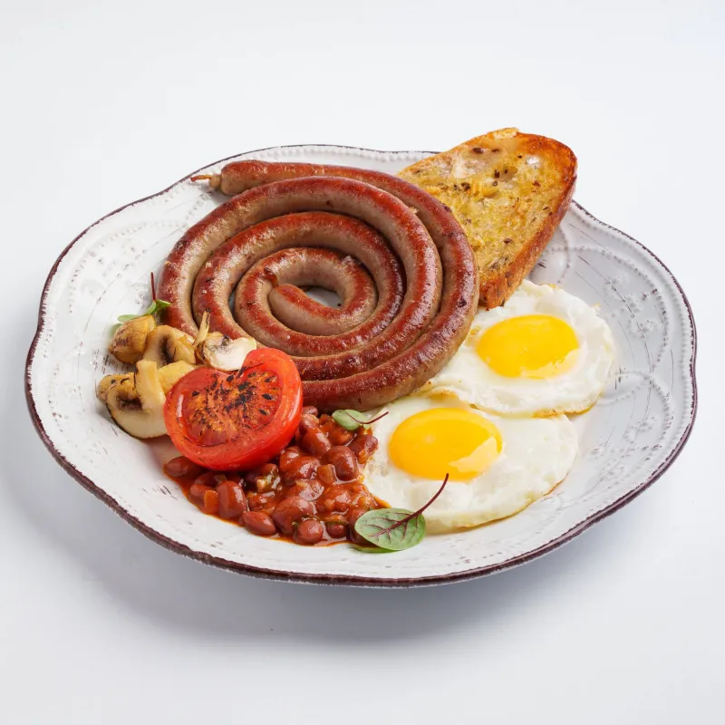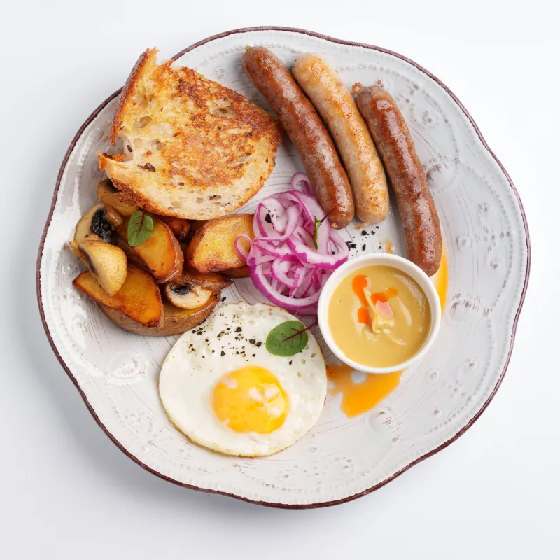 Глазунья, куриная колбаска, две говяжьи колбаски, обжареный картофель, шампиньоны, красный лук, поджаристый хлеб