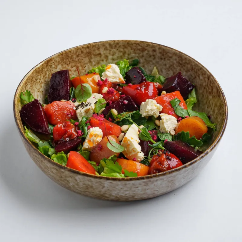 микс салата и зелени, запеченная морковь, запеченная свекла, маринованный перец, козий сыр, малиновый бальзамик, кедровые орешки
