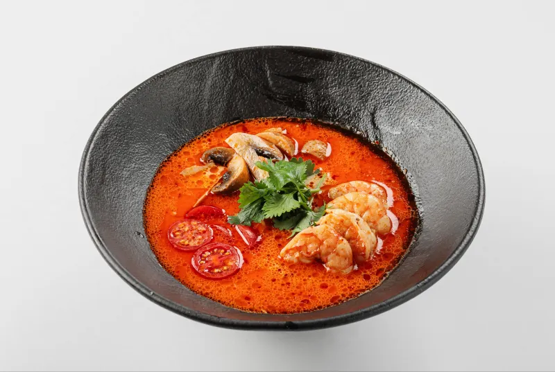 наваристый бульон с лимонной травой, листом лайма,корнем галангала и кокосовым молоком. Тигровые креветки, лапша, томаты черри, грибы шиитаке, кинза, лайм, чили перец, дайкон, зеленый лук, кунжут