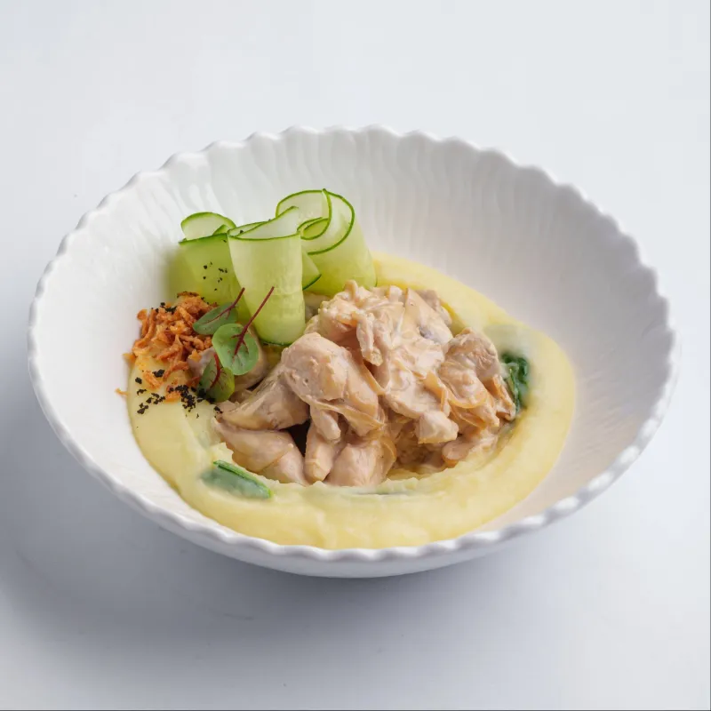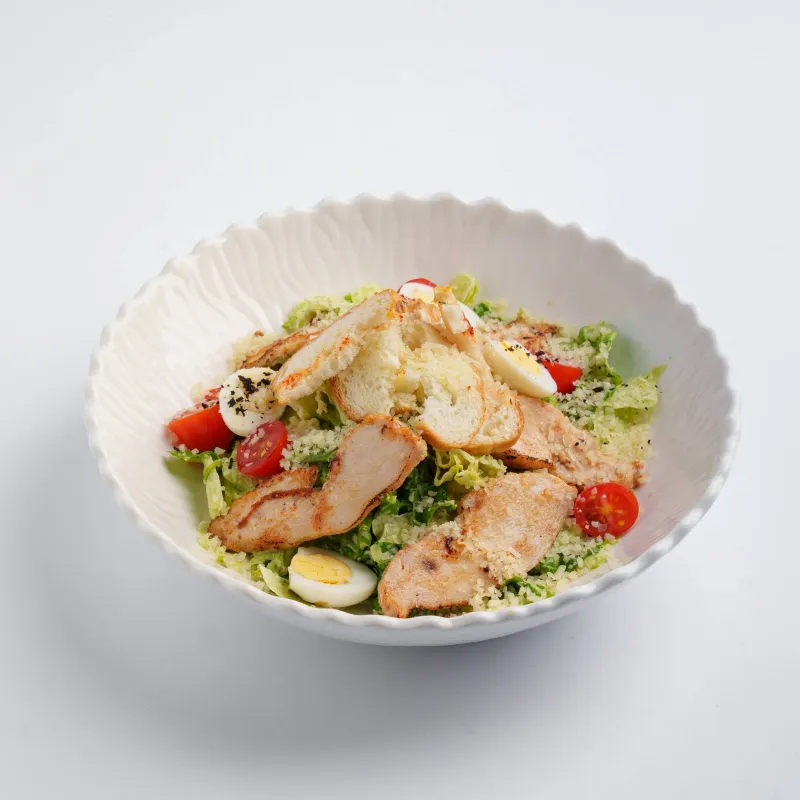 цыпленок сувид, лист салата, перепелиное яйцо, черри, соус цезарь, крутоны, пармезан.