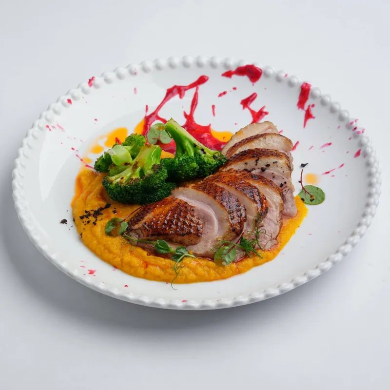 утиная грудка су вид, морковное пюре, брусничный соус, брокколи