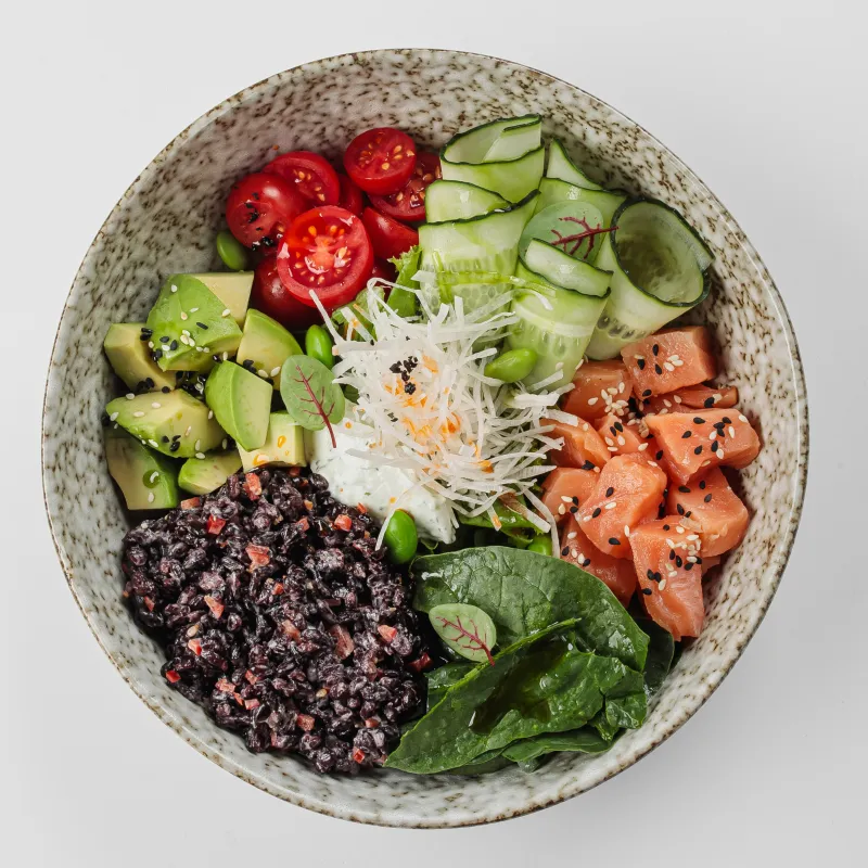На выбор: киноа, черный рис, рис, лосось малосольный, авокадо, огурец, томаты черри, ореховый соус, соус свит чили, дайкон, фасоль эдемами