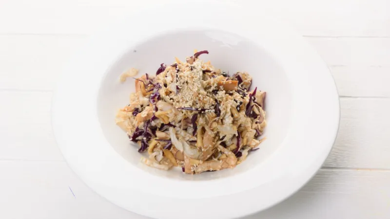 Курица цезарь, красная и пекинская капуста, тесто Вонтен, мед, кунжут, соевая заправка