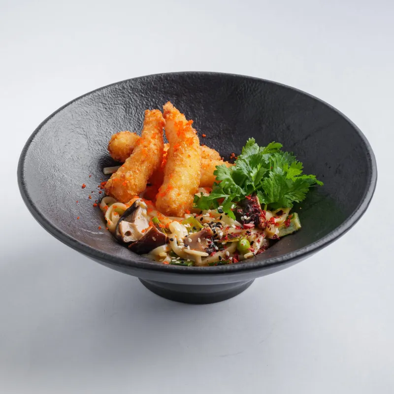 лапша удон, шиитаке, лук порей, фасоль, эдамаме, креветки панко, кинза