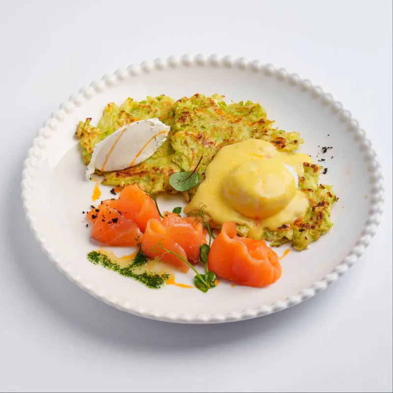 драники из цукини, слабосоленый лосось, яйцо пашот, крем чиз, голландский соус