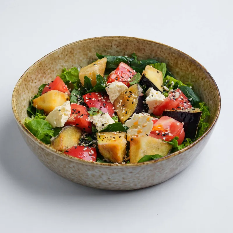 микс зелени, баклажаны, козий сыр, томаты, заправка свит чили, семечки, лист салата