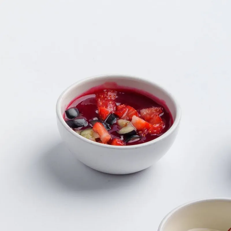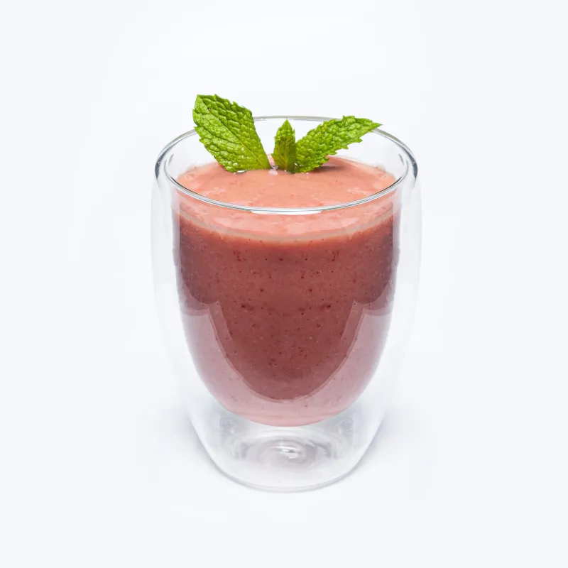 Клубника, авокадо, яблочный и лимоннный фреш, сироп топинамбура, мята.