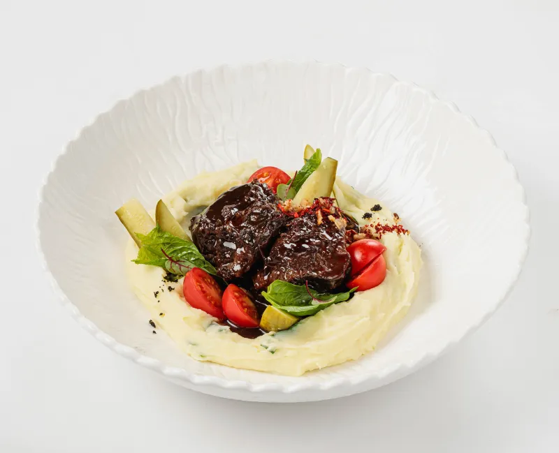 Телячьи щечки запечённые со специями и овощами. Приготовленные в соусе демиглас. Подаются с картофельным пюре со шпинатом, томатами черри, маринованным огурцом и луком фри.