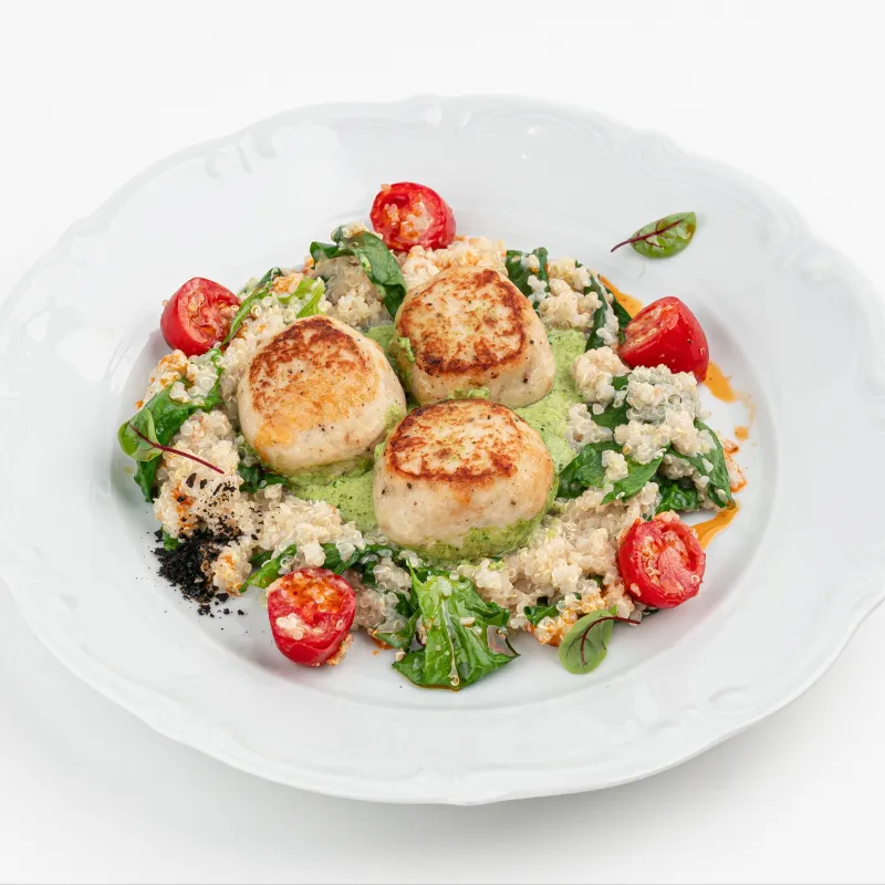 котлеты из индейки, киноа с ореховым соусом, шпинатом, томатами черри и соусом карри