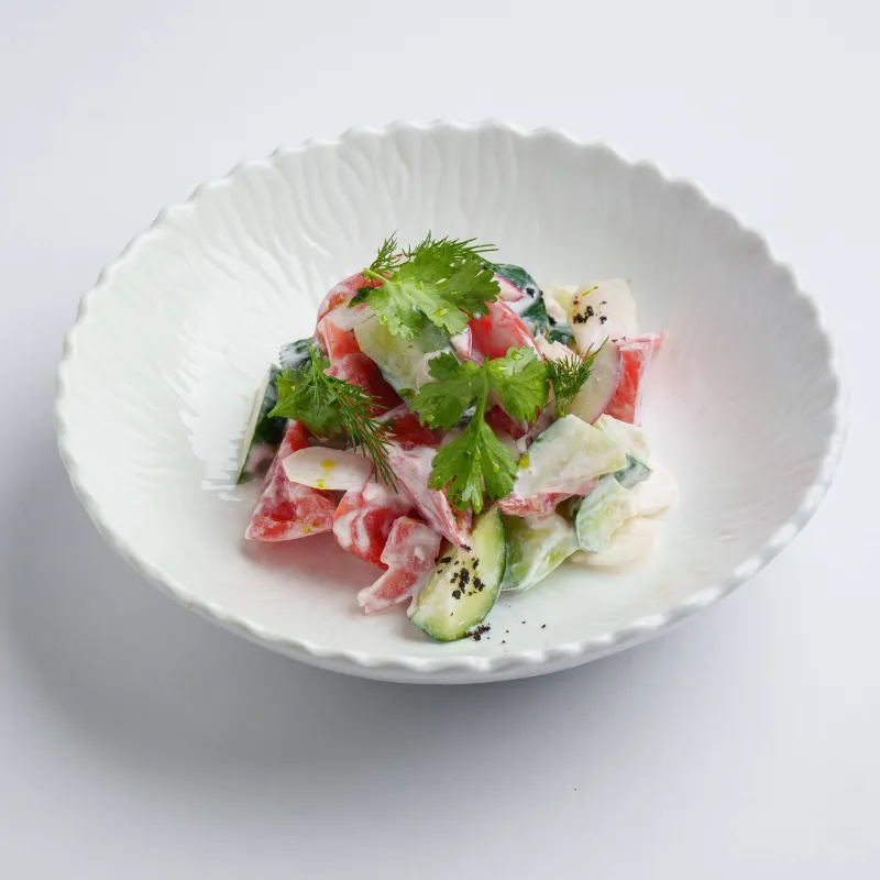 томат, огурец, красный лук, редиска, сметана, зелень