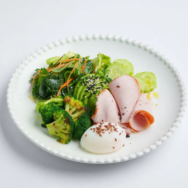 брокколи, авокадо, огурец, микс салата, яйцо пашот, копченая индейка, цитрусовый дрессинг
