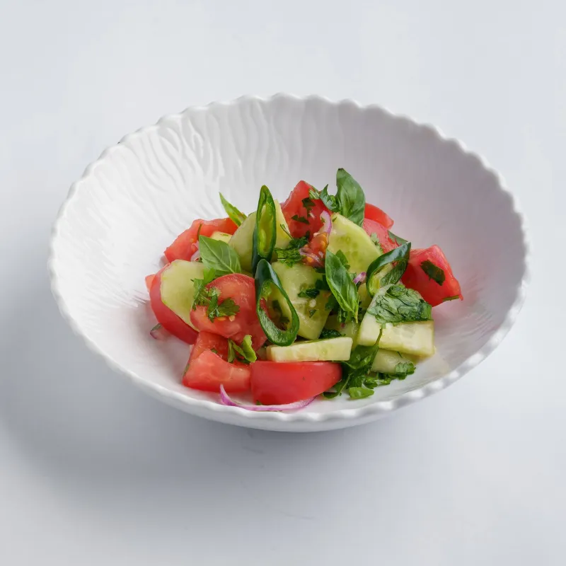 салат из свежих огурцов, томатов, зелени, полугорького перца