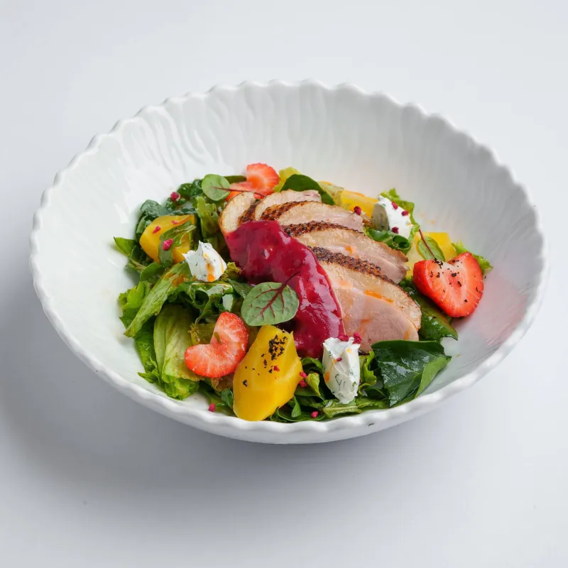 утиная грудка су вид, микс салата, запеченная морковь, крем чиз, малиновый бальзамик, брусничный соус