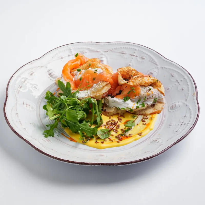 блины, крем чиз, слабосоленая лосось, голландский соус, руккола
