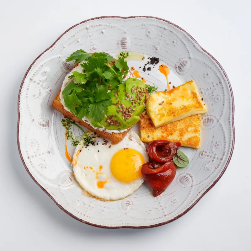 Хлеб бриошь, яйцо, авокадо, брокколи, цветная капуста, черри, сыр халуми, кинза и соус дзадзики