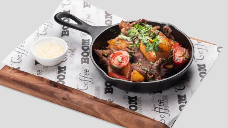 Вырезка говядины, обжаренная с картофелем, сочными черри и грузинскими специями, с добавлением чеснока