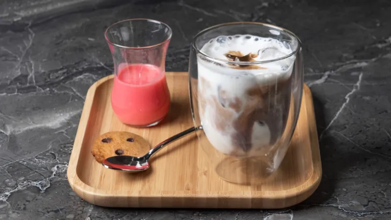 Молоко, клубничный соус, кофе, подается со льдом.