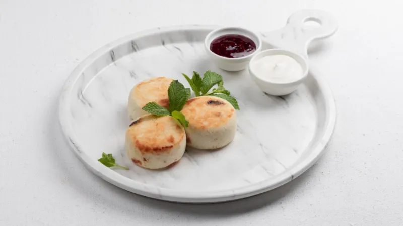 Обезжиренный творог, изюм, мята, джем, сметана