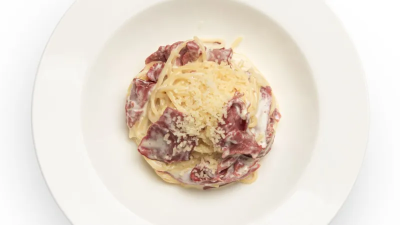 Спагетти твердых сортов, копченая говядина, чеснок, желток, сливки, пармезан.