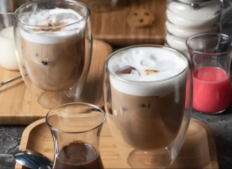 Молоко, клубничный соус, кофе, подается со льдом.