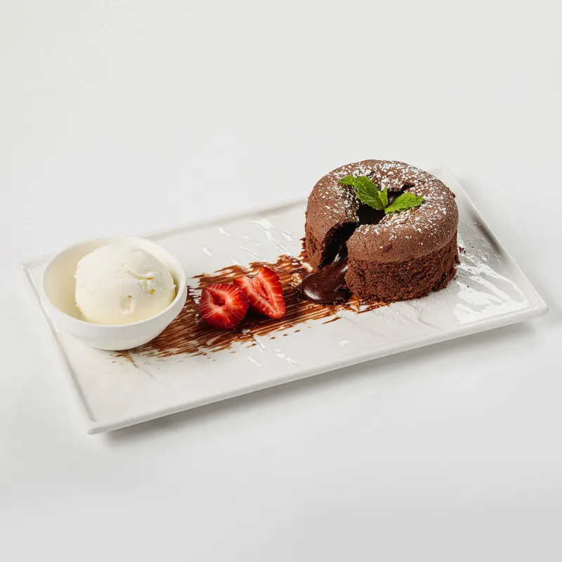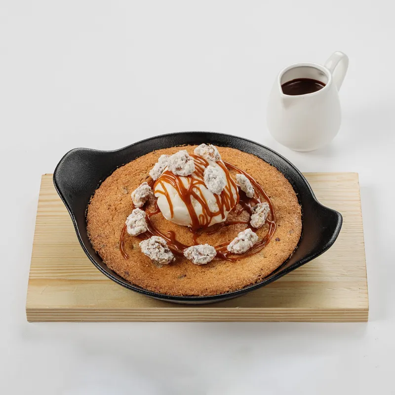 Горячее печенье с кусочками шоколада, соленой карамелью и орешками. Подаётся с мороженым и шоколадным соусом