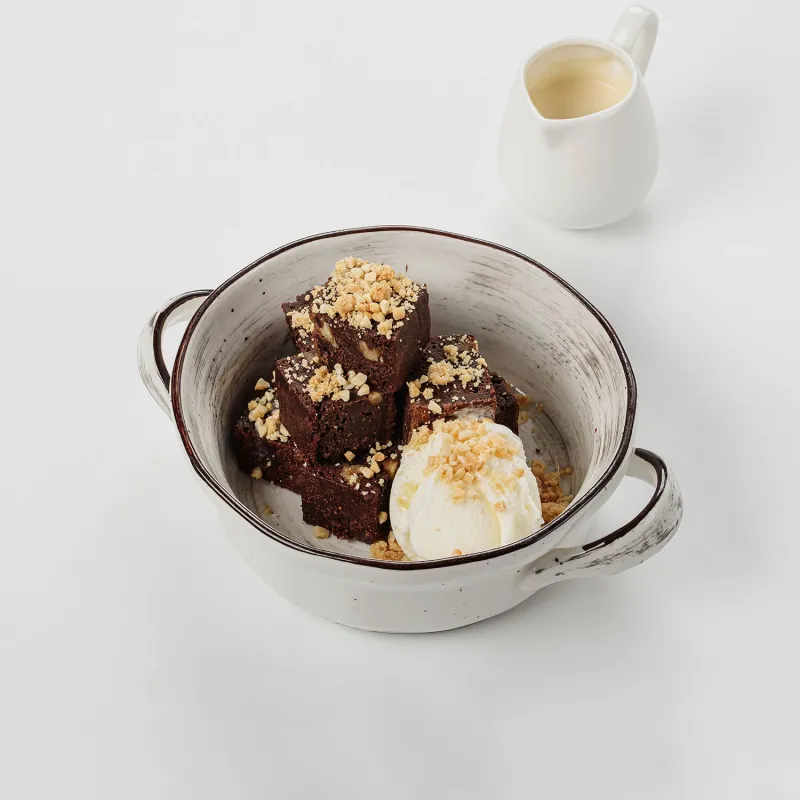 Мини брауни с грецким орехом, миндальной крошкой. Подаётся со сливочным мороженым.