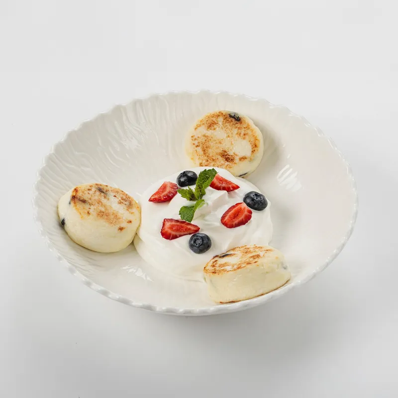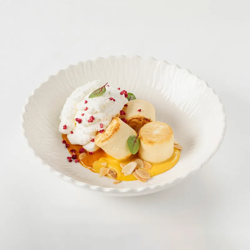 Сырники с добавлением рисовой муки. Подаются с воздушными взбитыми сливками, заварным кремом,манговым соусом. Слайсы миндаля, сублимированной малины