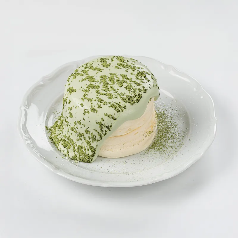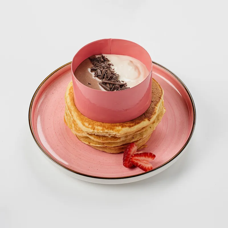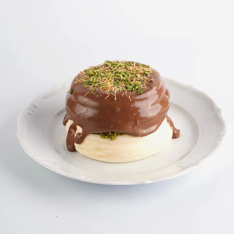 Воздушные панкейки, начинка из фисташкового пралине с катаифи, шоколадный соус.