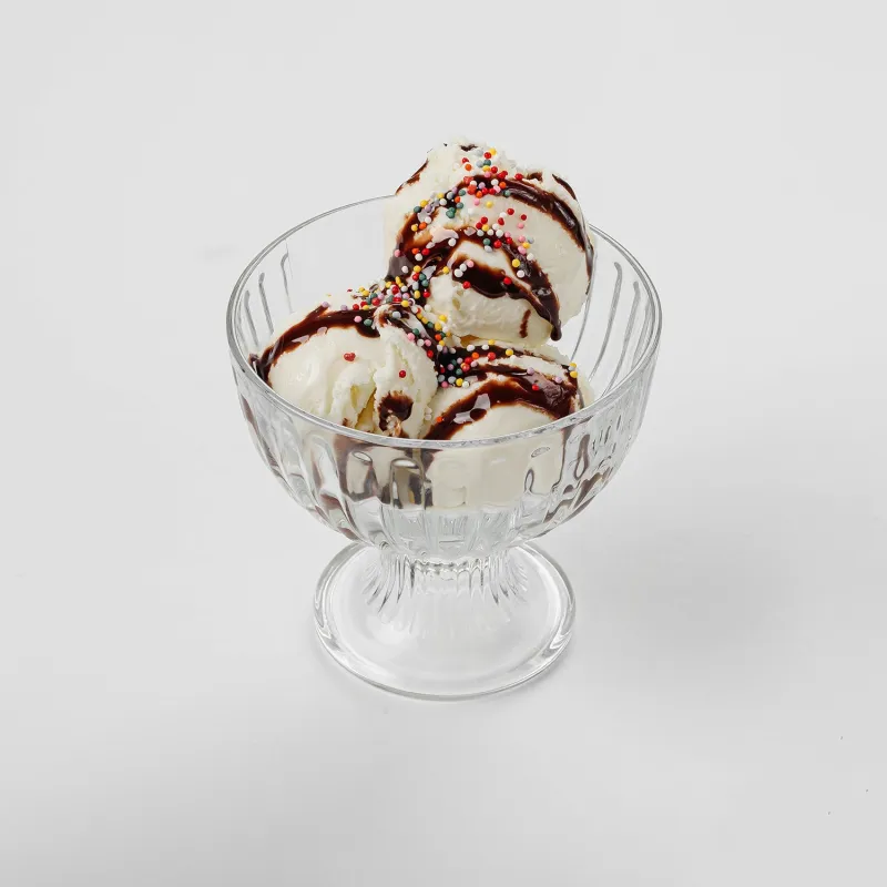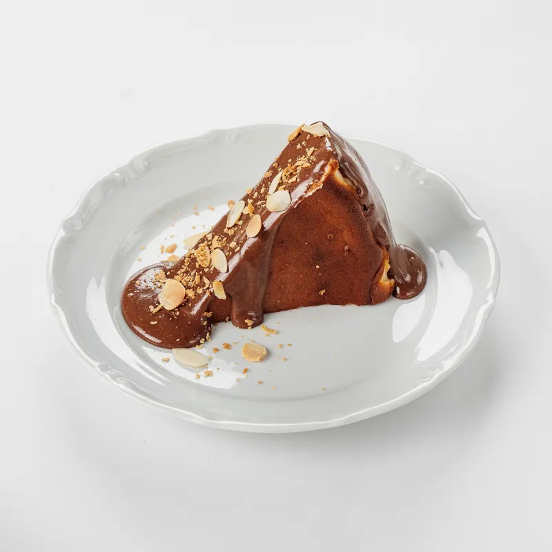 Подаётся с шоколадным соусом, вафельной крошкой и миндалем