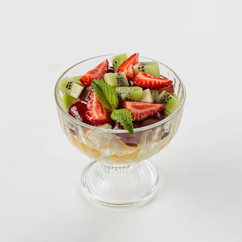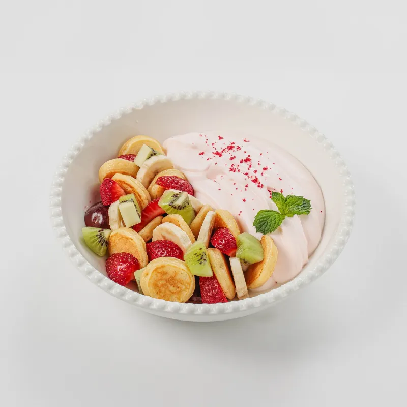 Микс из маленьких панкейков, киви, банана, винограда и свежих ягод со сливочно-клубничным кремом