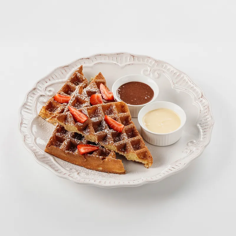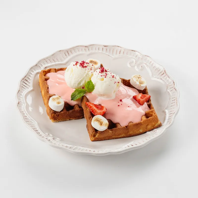 Бельгийские вафли с мороженым, клубничный соус и маршмеллоу