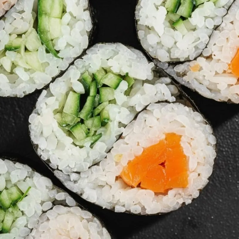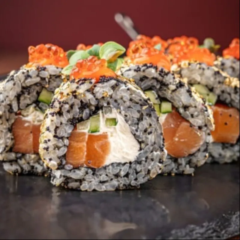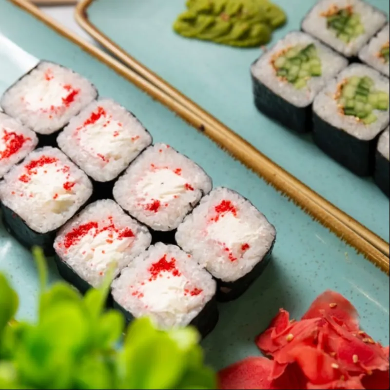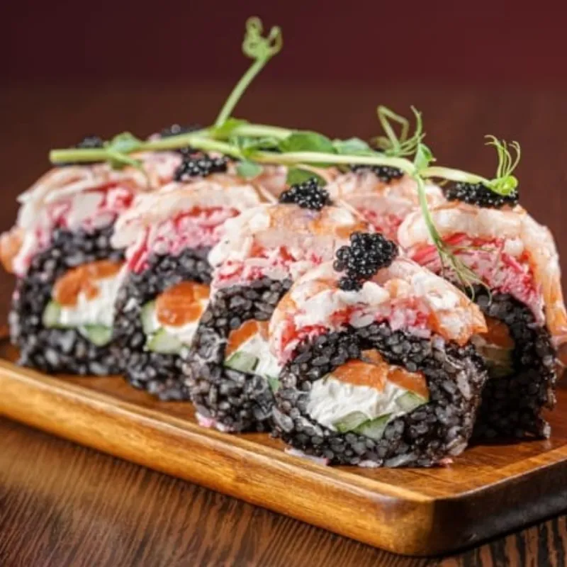 Рис, креветка, нори, лосось, огурец, творожный сыр, краб, черная икра, зелень