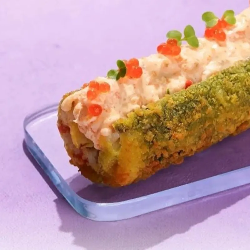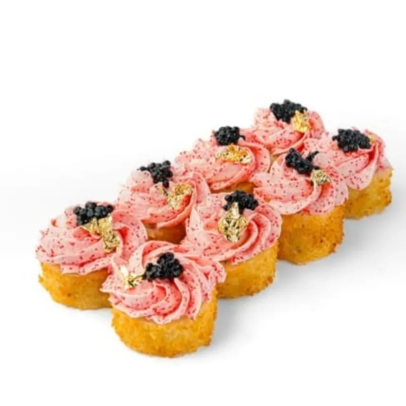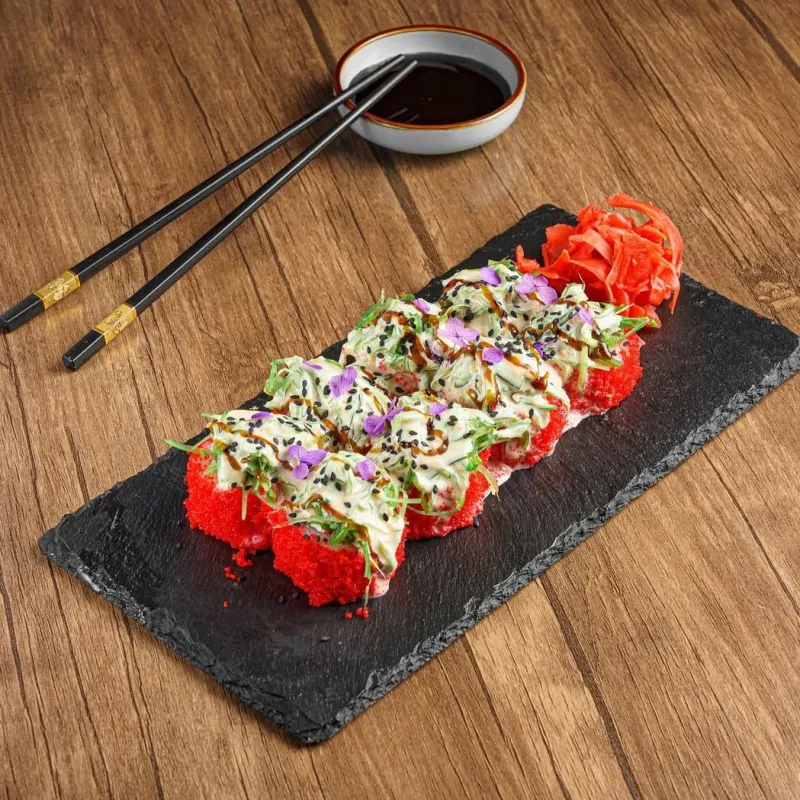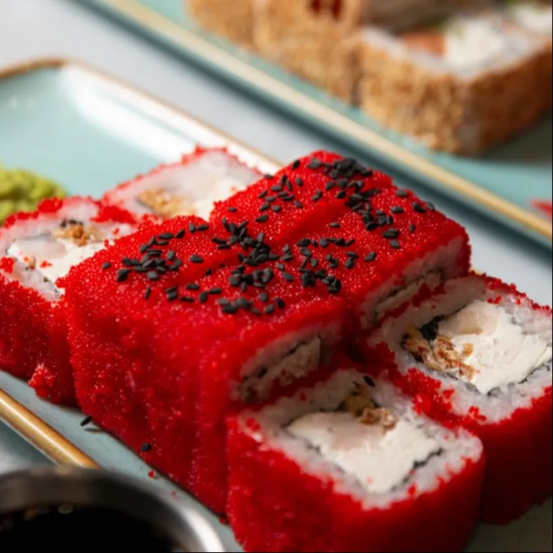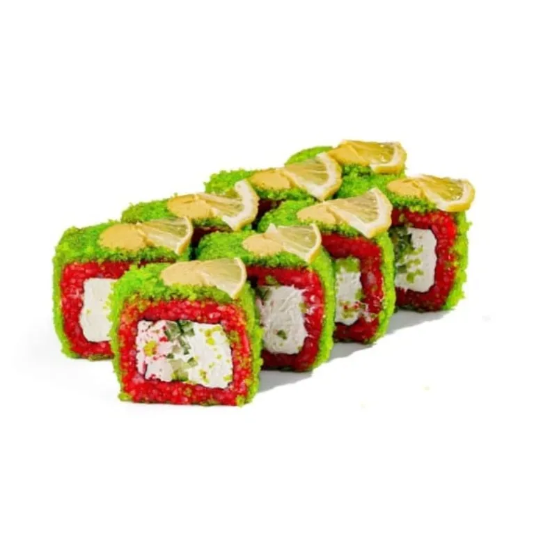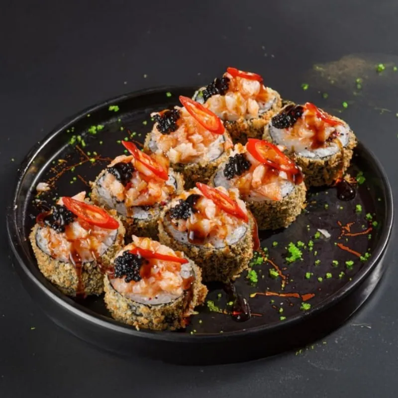 Рис, творожный сыр, зелёная икра масаго, тигровые креветки, соус сладкий чили, перец чили, чёрная икра