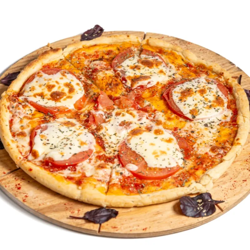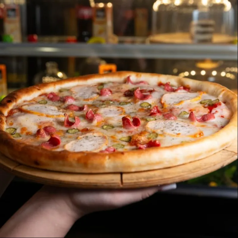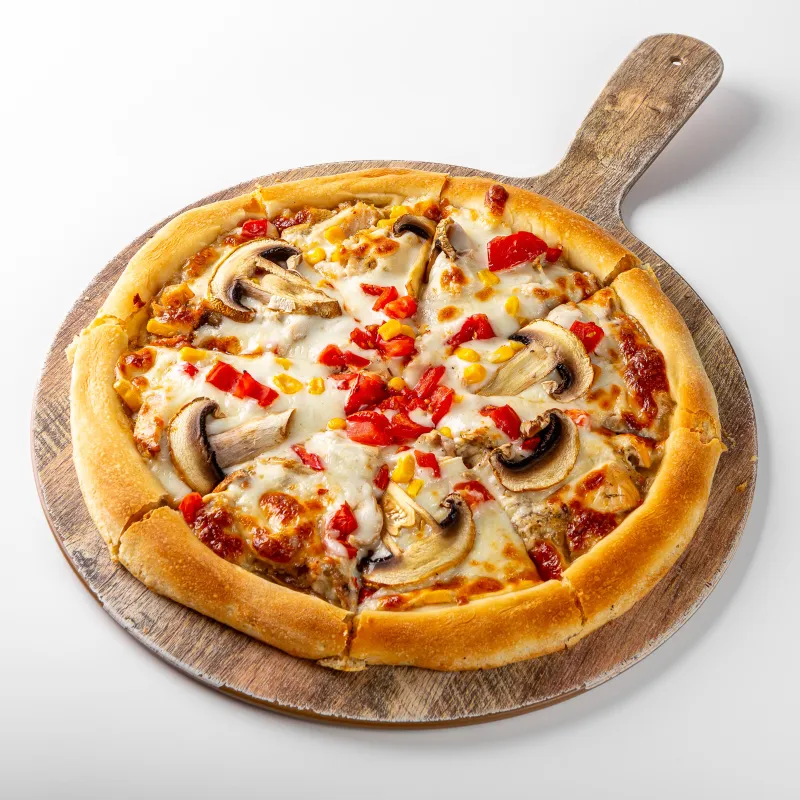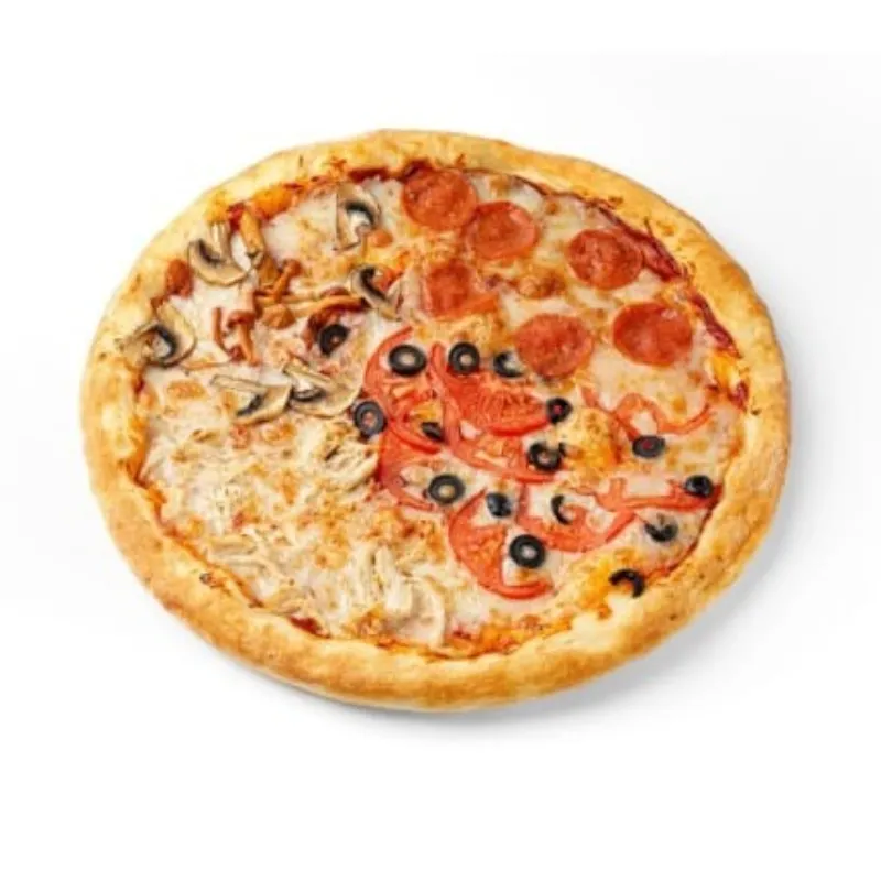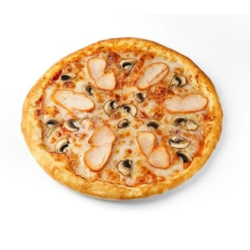 Фирменый соус, сыр Моцарелла помидоры, маслины, грибы шампиньоны, грибы опята, куриная начинка, колбаски пеперони