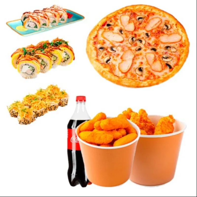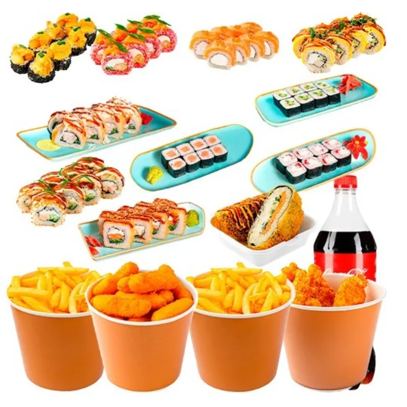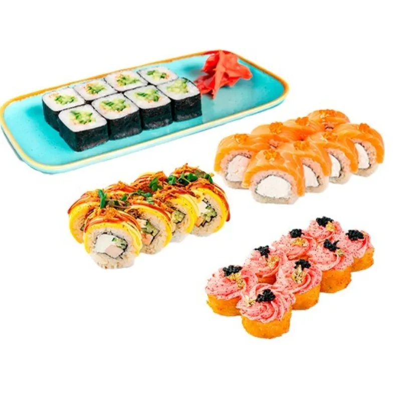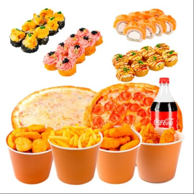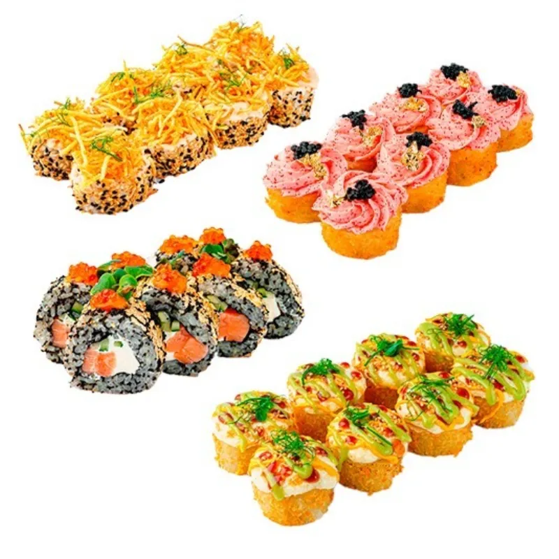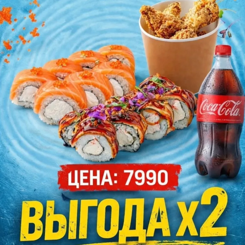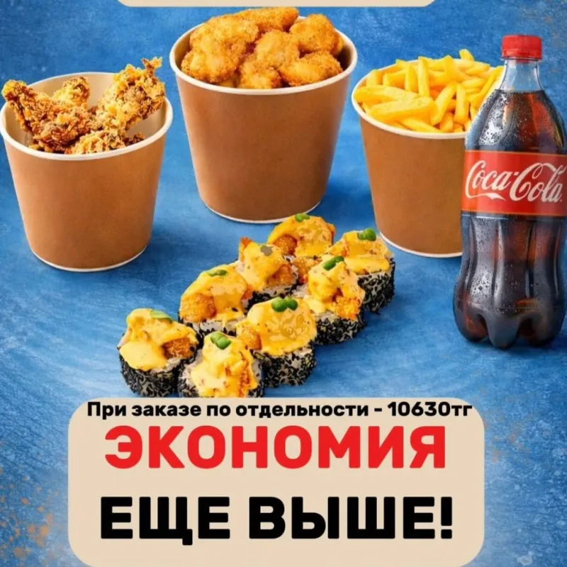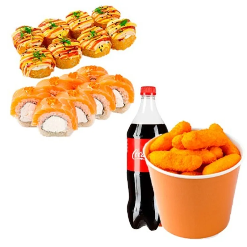 Ролл Филадельфия 8 шт. ролл Сакура 8 шт. ролл Самурай 8 шт. ролл Вулкан 8 шт. ролл Чиз 8 шт. ролл Бургер 8 шт. ролл Америка темпура 8 шт. ролл Цезарь темпура 8 шт. ролл Каппа маки 8 шт. ролл Каппа маки 8 шт. ролл Чиз маки 8 шт. картофель фри 2 шт. стрипсы 15 шт. куриные крылышки 15 шт. Coca-Cola 2 л.