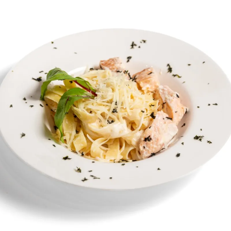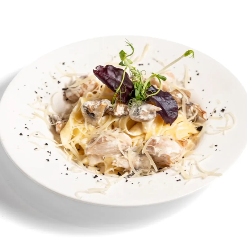 Куриное филе, фетучини, шампиньоны, сливки, пармезан