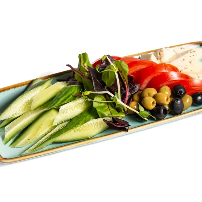 Огурцы, томаты, сладкий перец, маслины, сыр, зелень