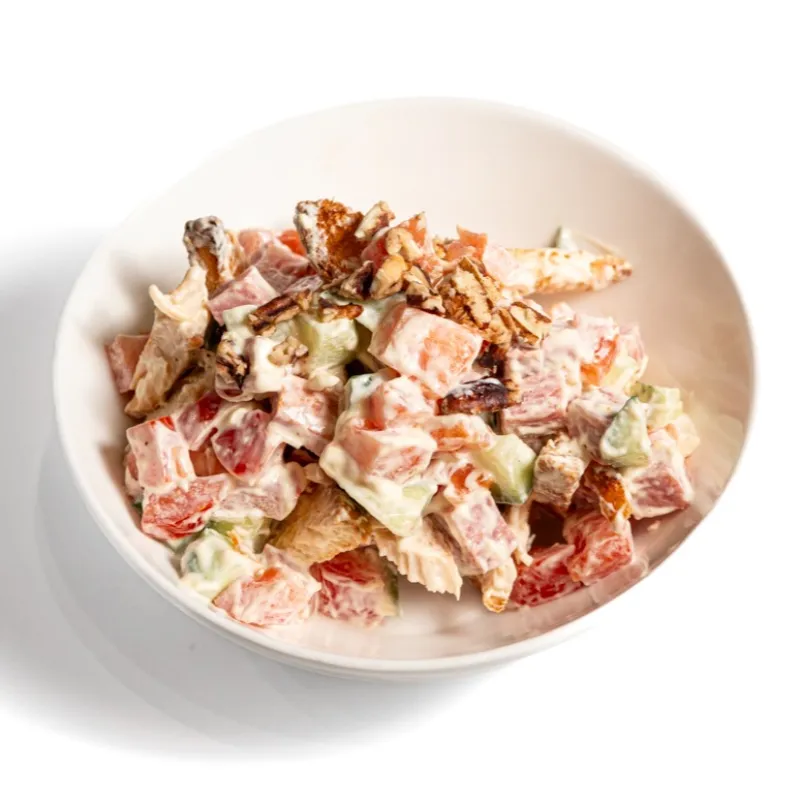 Копченая колбаса, курица, свежие огурцы, помидор, гренки, грецкий орех, соус