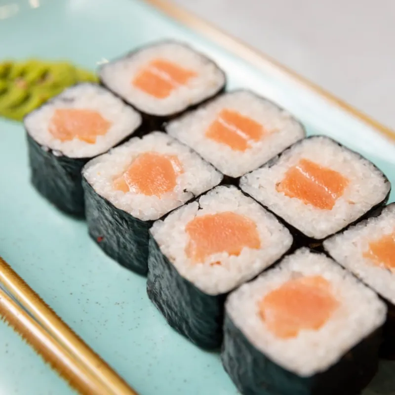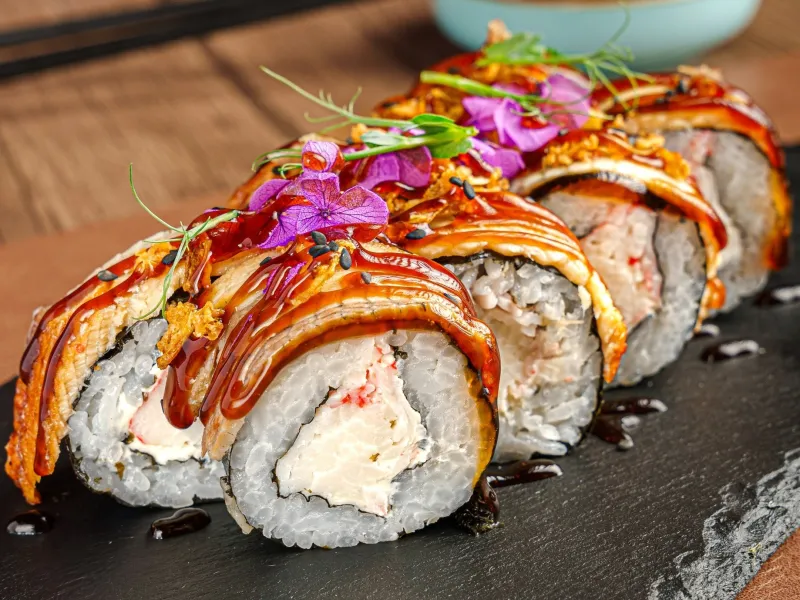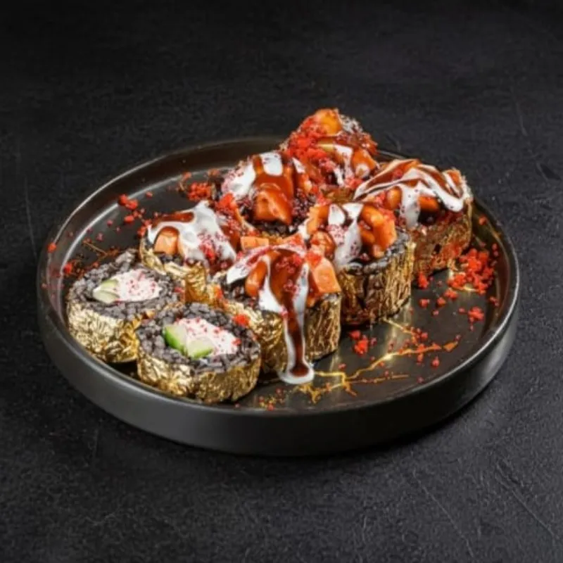 Рис, сусальное золото, творожный сыр, лосось, огурец, сливки, соус унаги, красная икра масаго