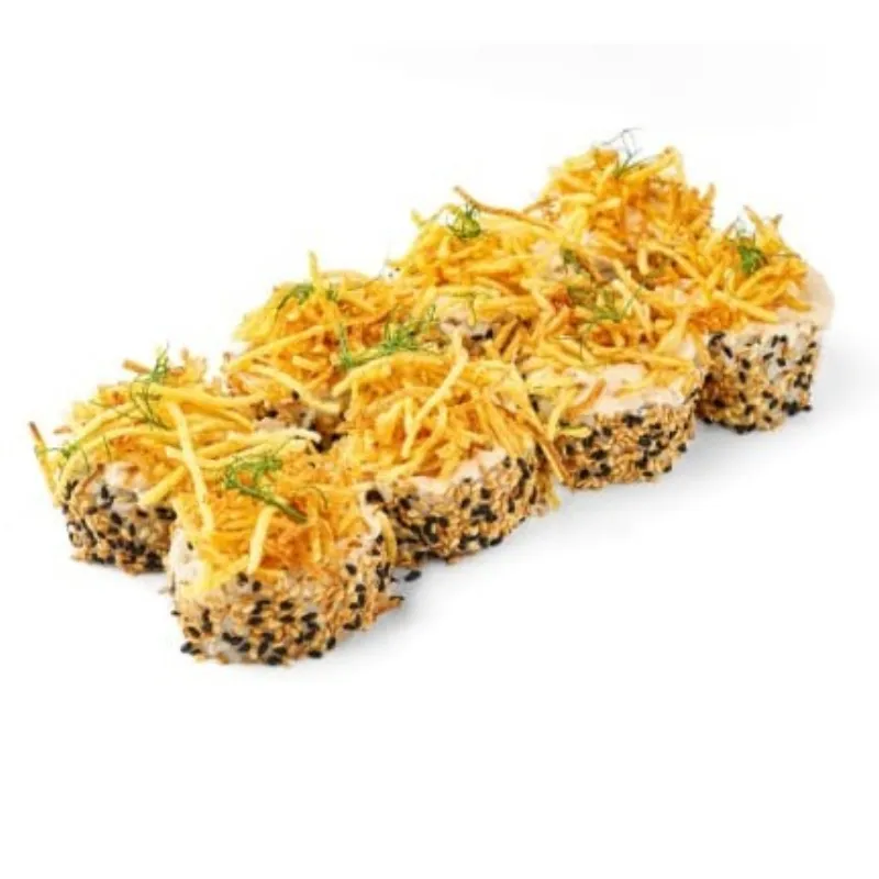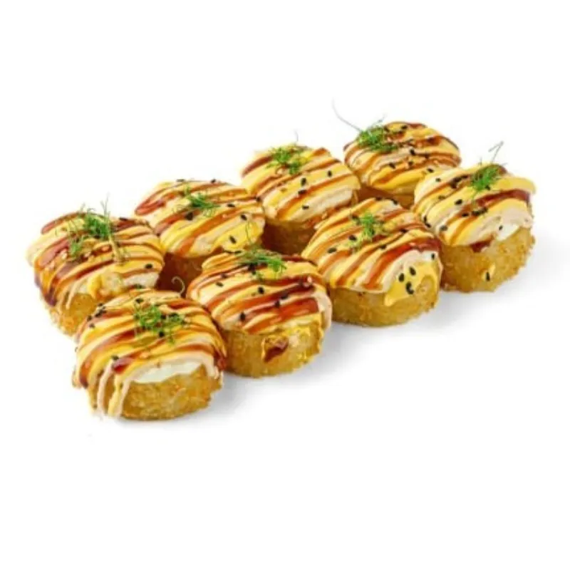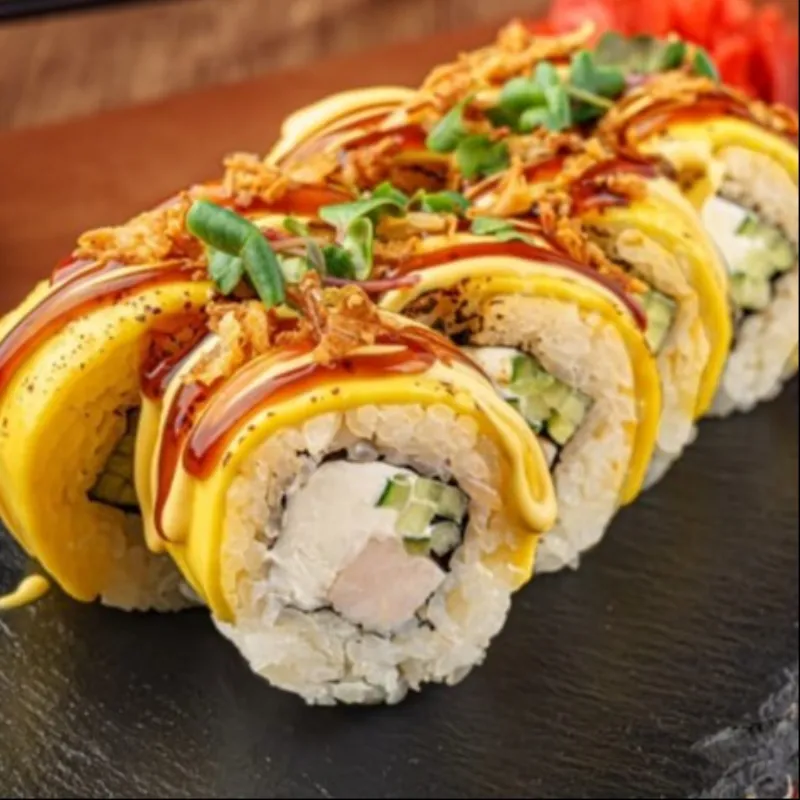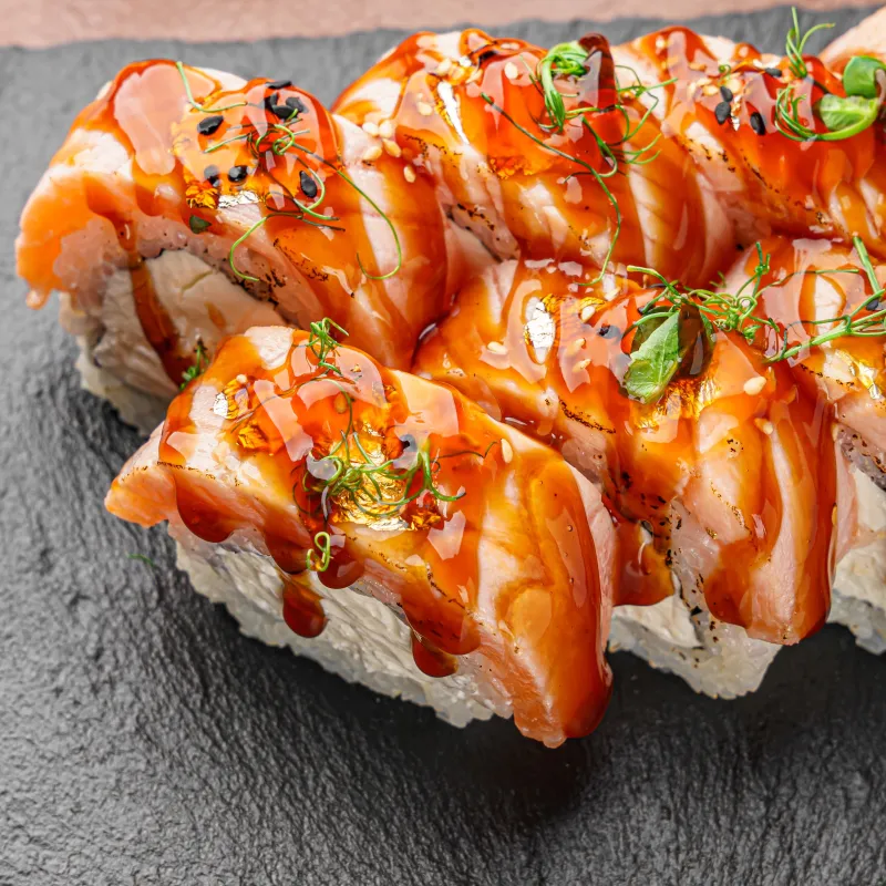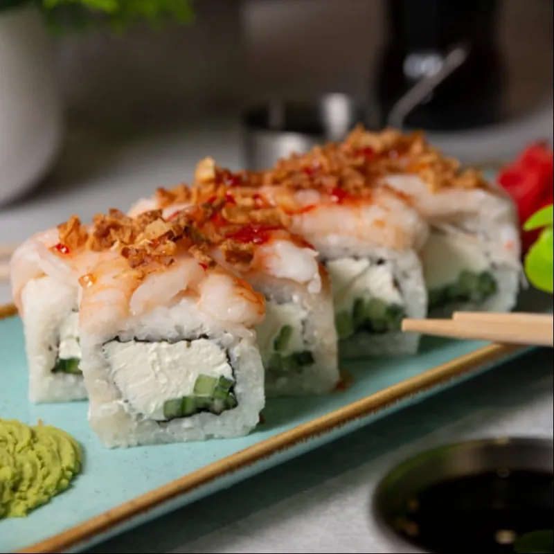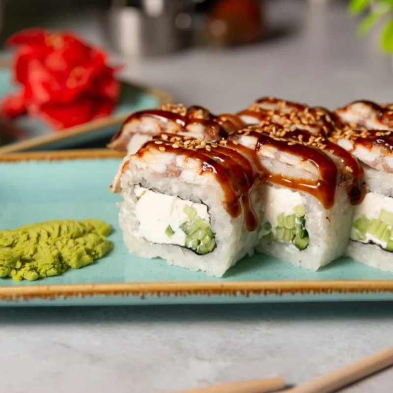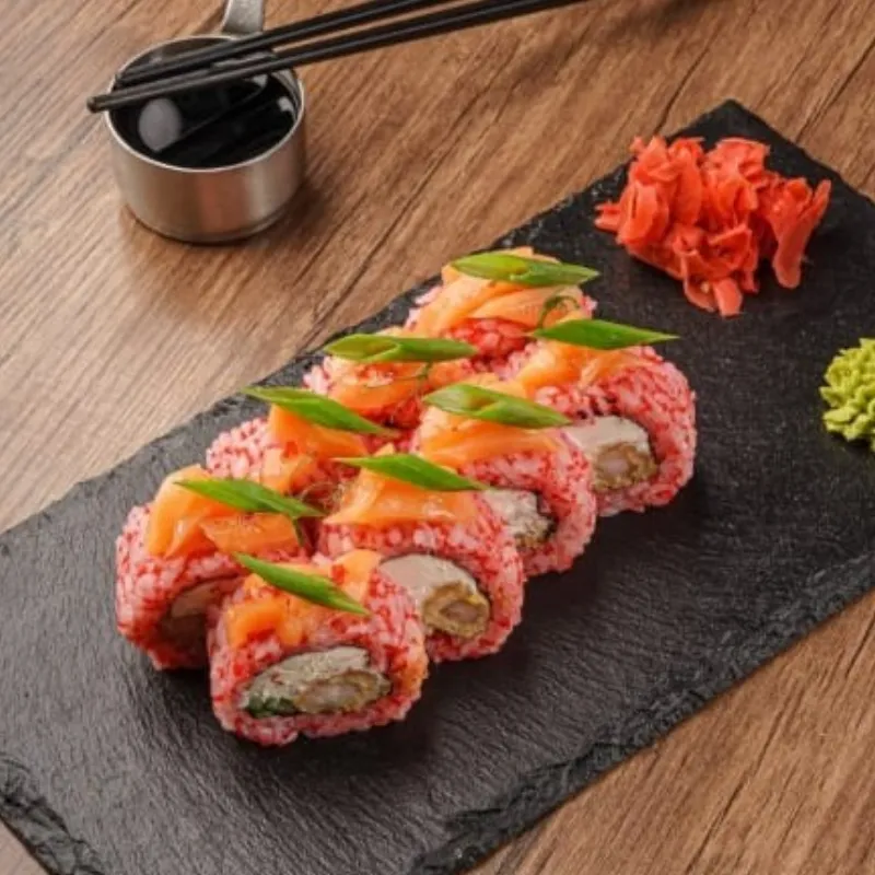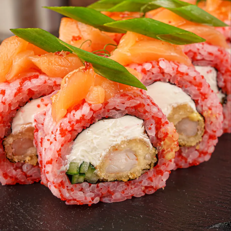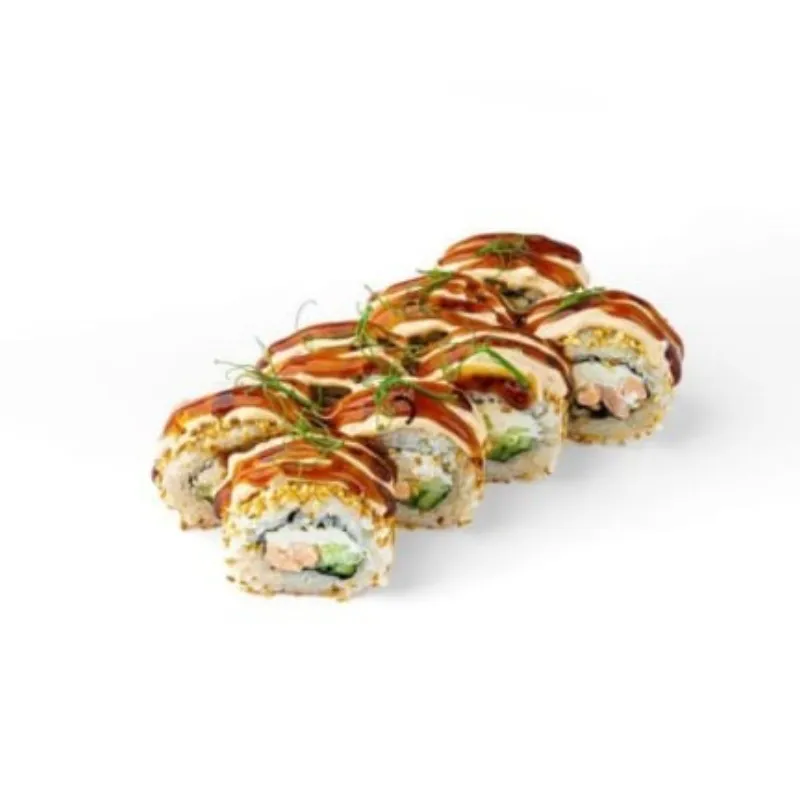 Рис, лосось, креветка темпура, творожный сыр, огурец, соус унаги, сливки тобико (нефритовый соус), жареный лук