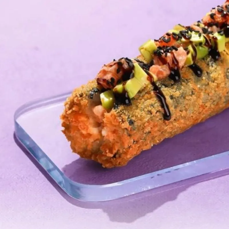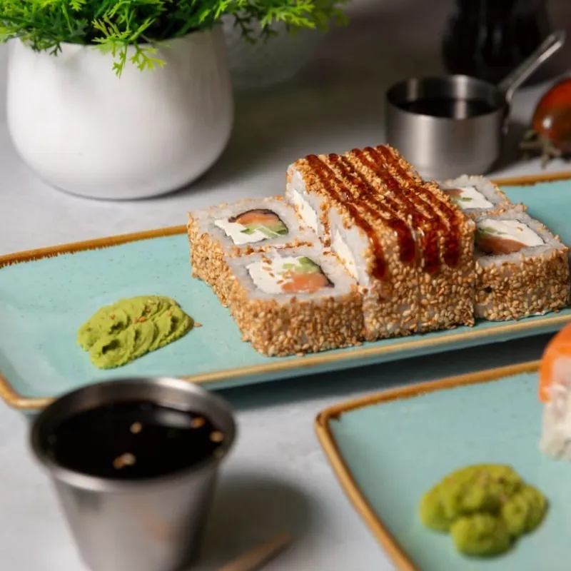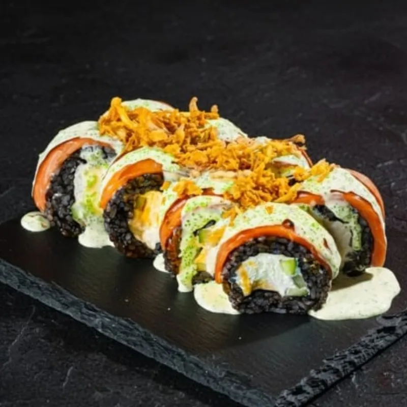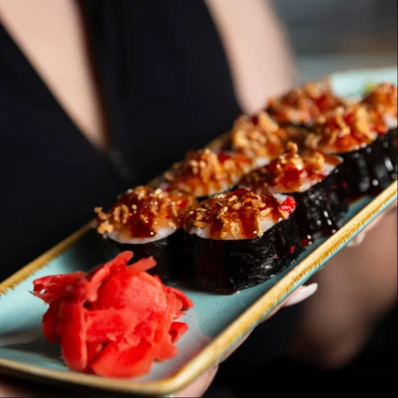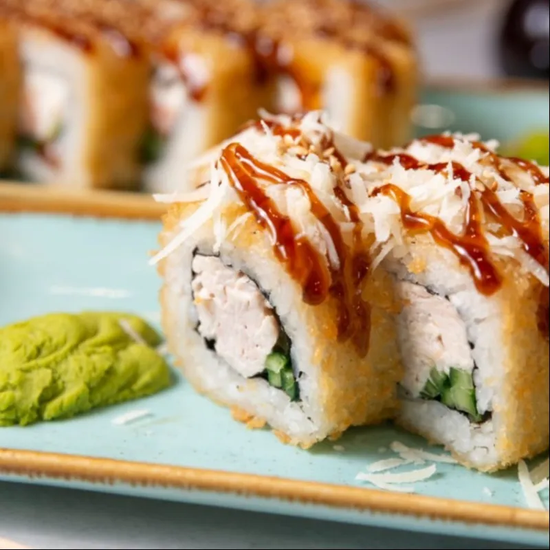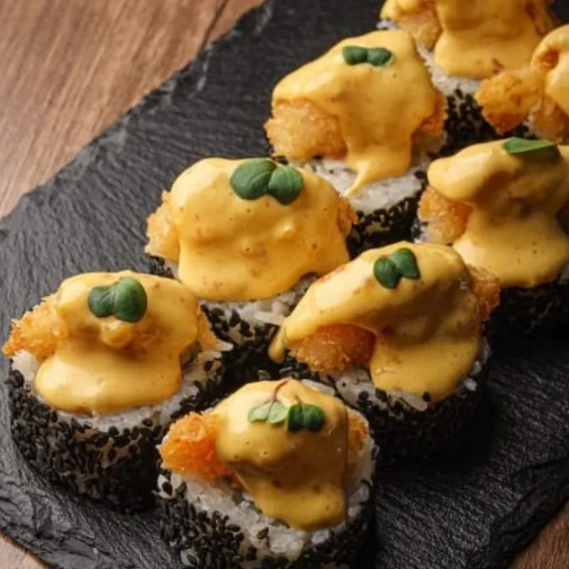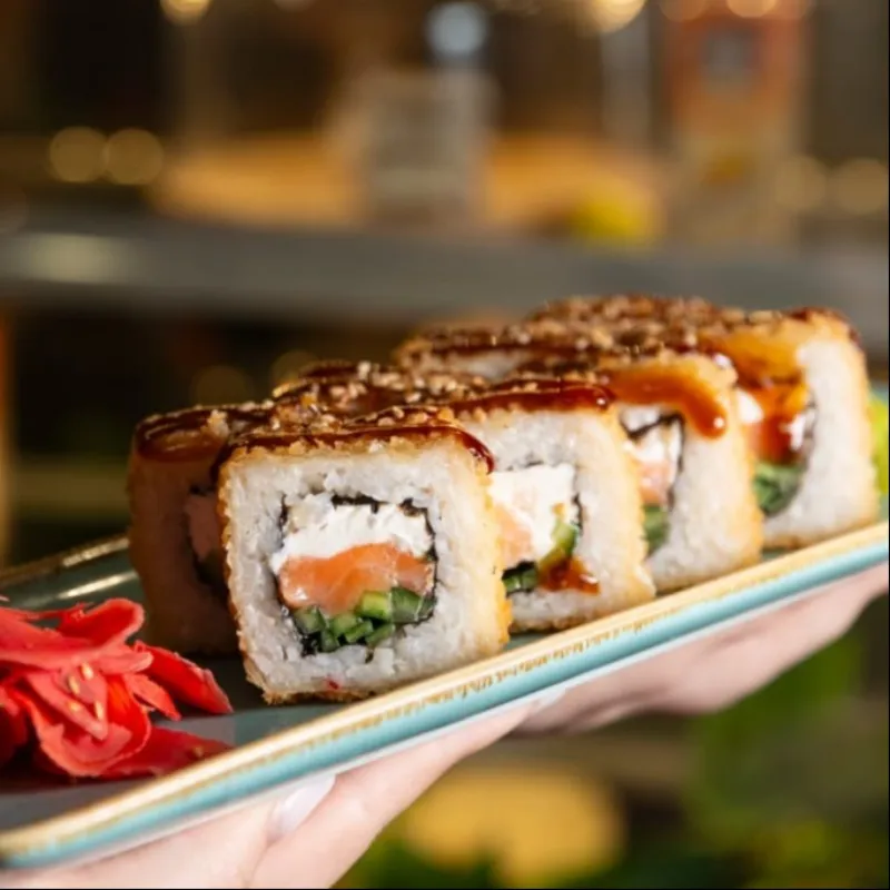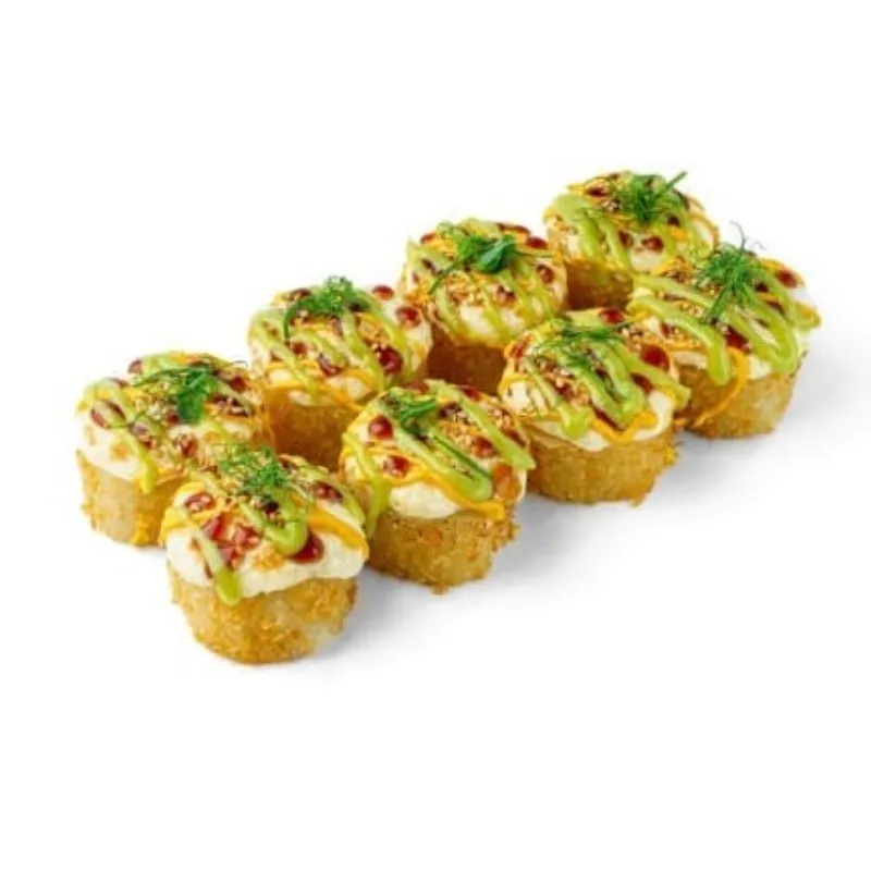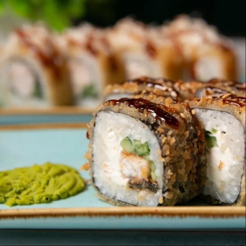 Рис, лосось, креветка темпура, творожный сыр, огурец, соус унаги, сливки тобико (нефритовый соус), жареный лук