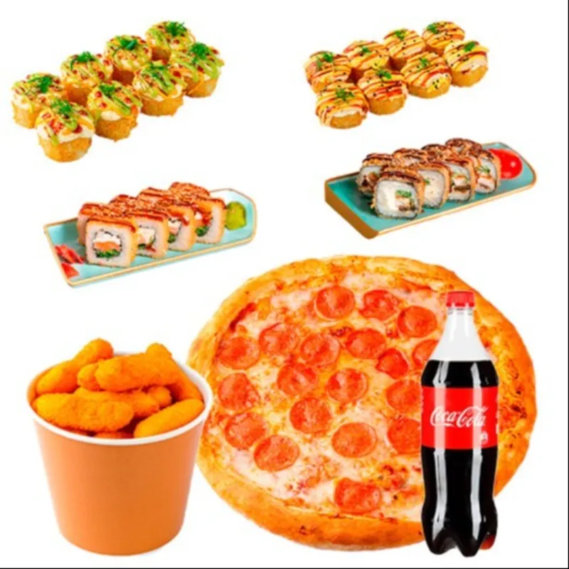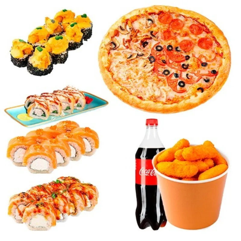 Ролл Филадельфия премиум 8 шт. ролл Ясай темпура 8 шт. ролл Вулкан 8 шт. ролл Лава 8 шт. Пицца 4 сыра 30 см.Пицца Пеперони 30 см. картофель фри 2 шт. наггетсы 10 шт. стрипсы 10 шт. куриные крылья 10 шт. Coca-Cola 2 л.