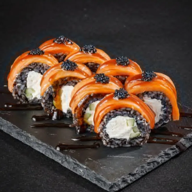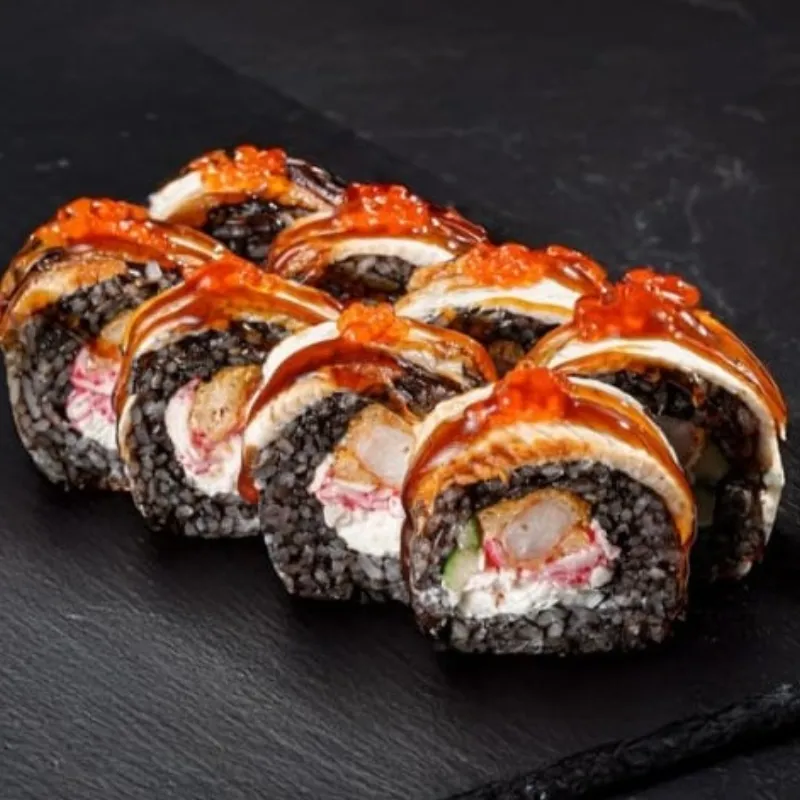 Рис, лосось, творожный сыр, огурец, соус унаги, черная икра